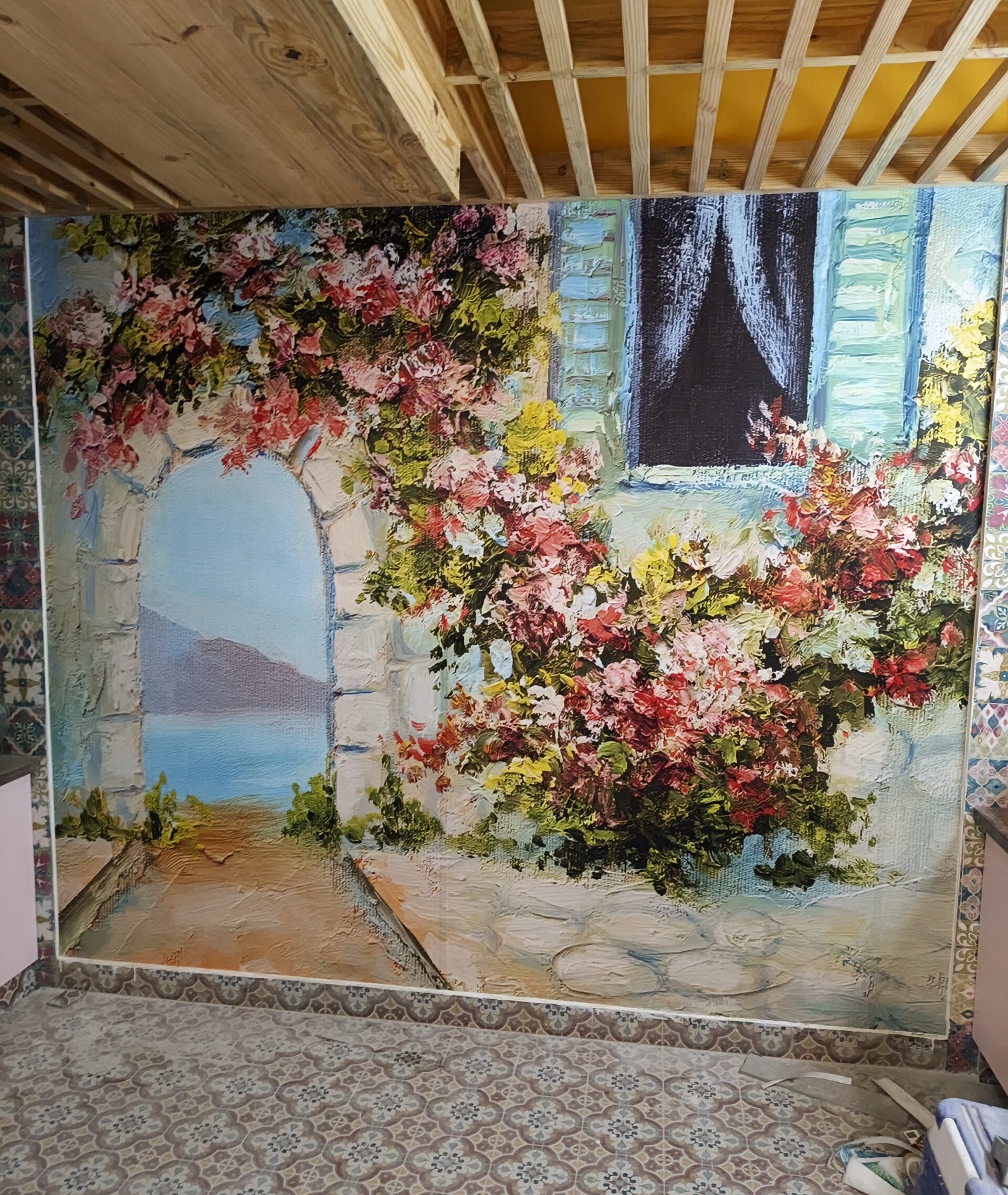 A painting of a house with flowers on the wall - Magicdecor®