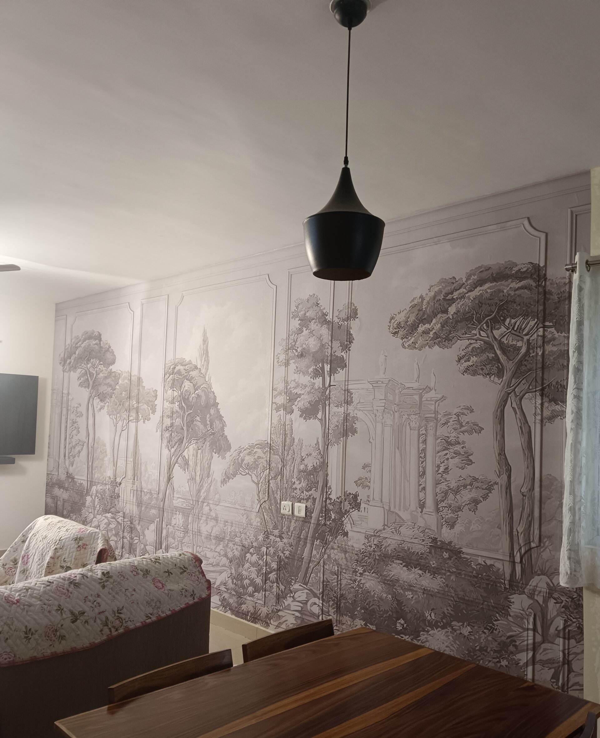 • Fancy Moulding Panel Design: The mural is brought to life with the impact of fancy moulding panels, which also give the whole design an elegant and sophisticated architectural quality reminiscent of old-world stately homes.