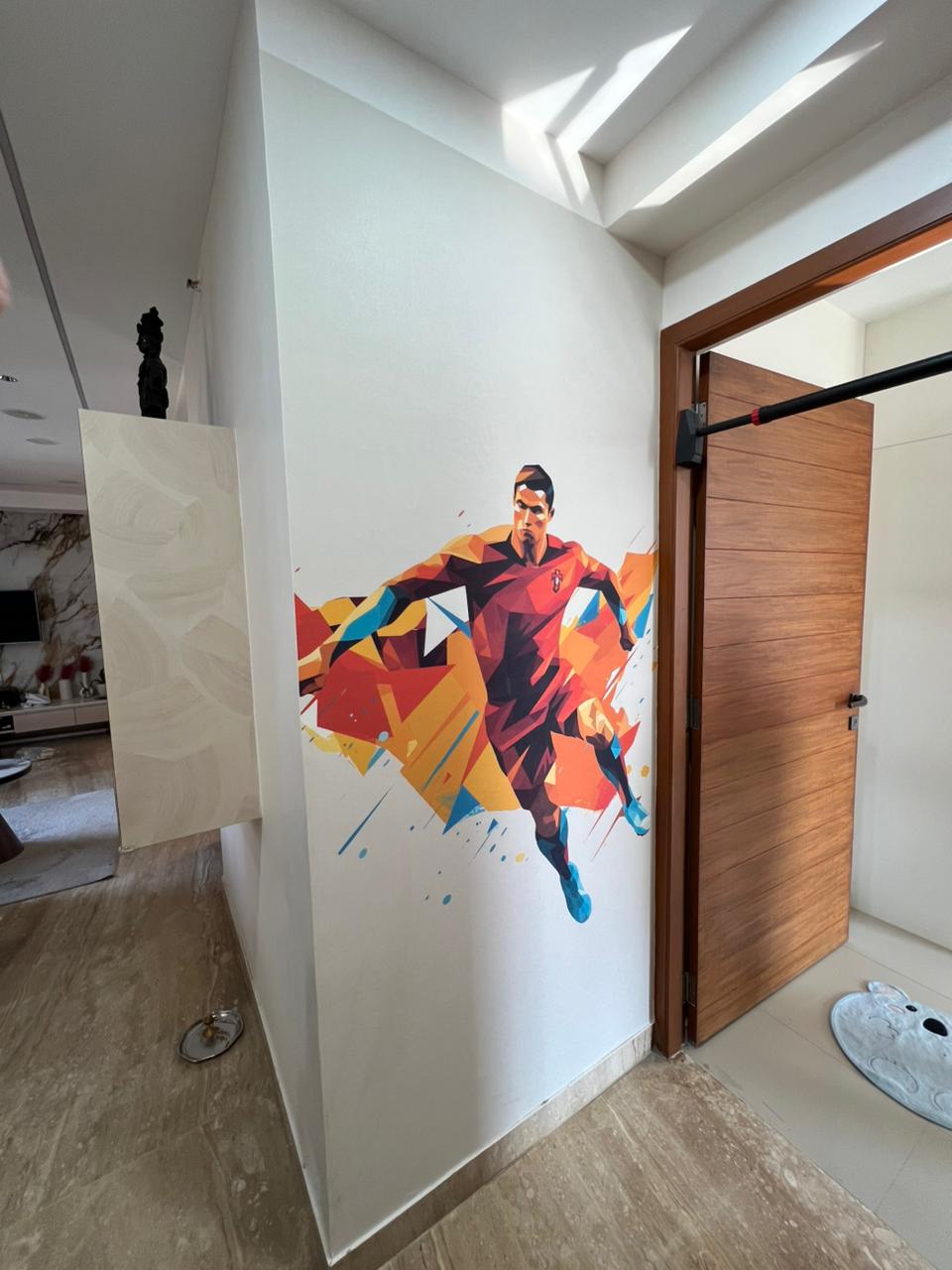 This wallpaper mural pays homage to one of the most recognizable players in football and is ideal for decorating the walls of any fan club headquarters, sports-themed room, or football enthusiast’s room. Ronaldo’s charisma and athleticism are well depicted, evoking both wonder and admiration in equal measure.